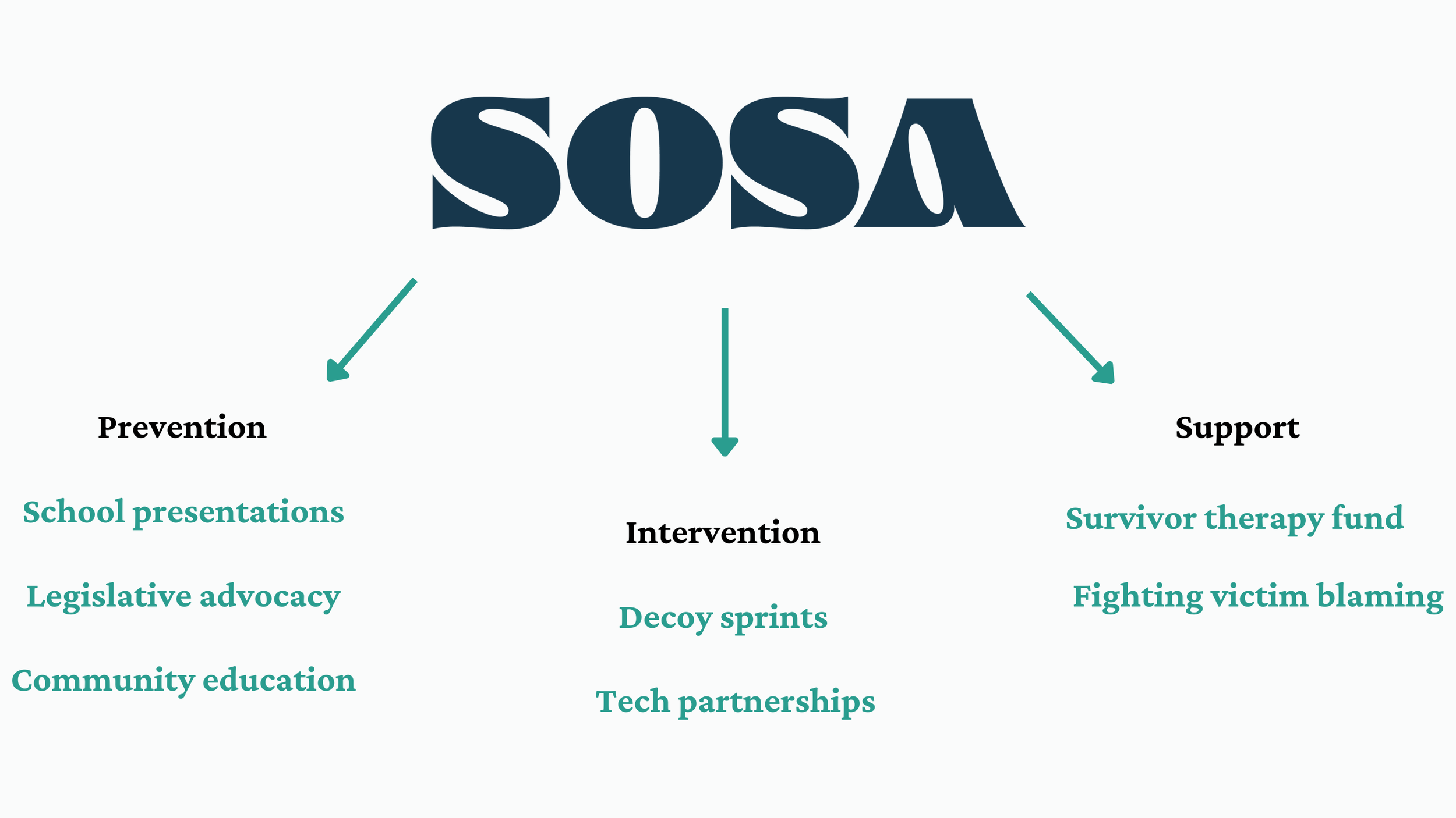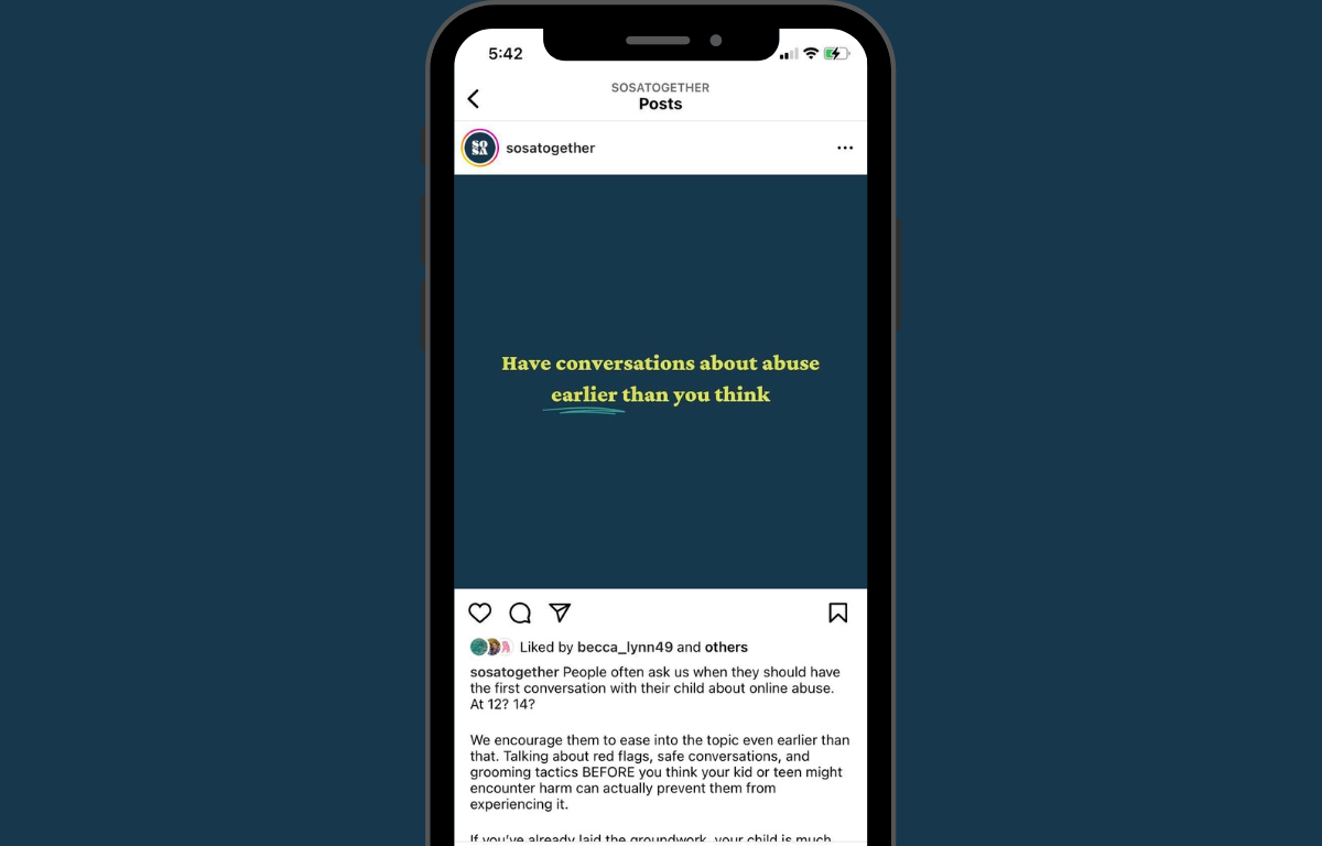 A culture of victim blaming is a major contributor to victims of online sex abuse not feeling safe to come forward about what they've experienced. SOSA combats this by reminding survivors that what happened to them was not their fault, dispelling myths about whether kids can be culpable (they can't), and spreading awareness about ways communities can help survivors feel safe coming forward.